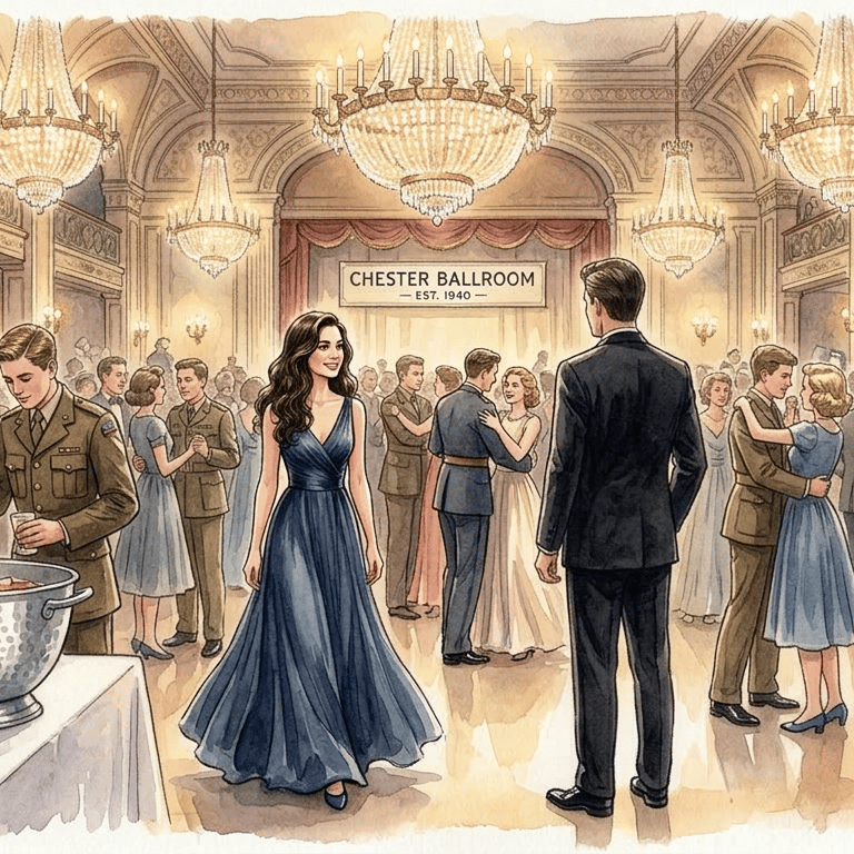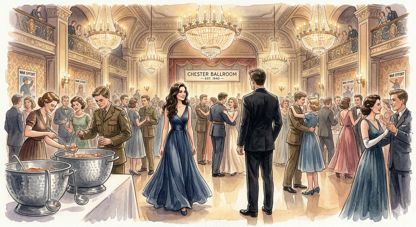 Sono Michael. Insegnante di matematica, trent'anni, smoking nero, scarpe lucide. È il 1940 e sono in una grande sala da ballo a Chester — lampadari enormi, luce calda. Aspetto lei: un'altra insegnante, capelli scuri, vestito elegante.