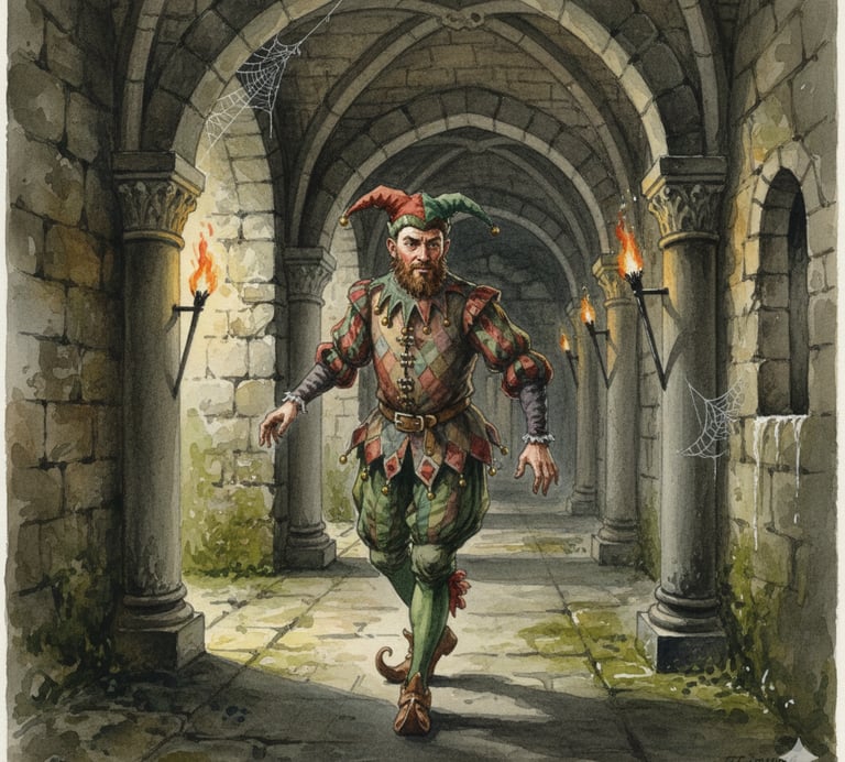 Nella sala grande ardono le fiaccole, ma sono solo. Scendo nei sotterranei, curiosando tra le ombre e le pietre umide. Cerco informazioni. È questo il mio lavoro — non far ridere, ma ascoltare. Osservare. Riferire.